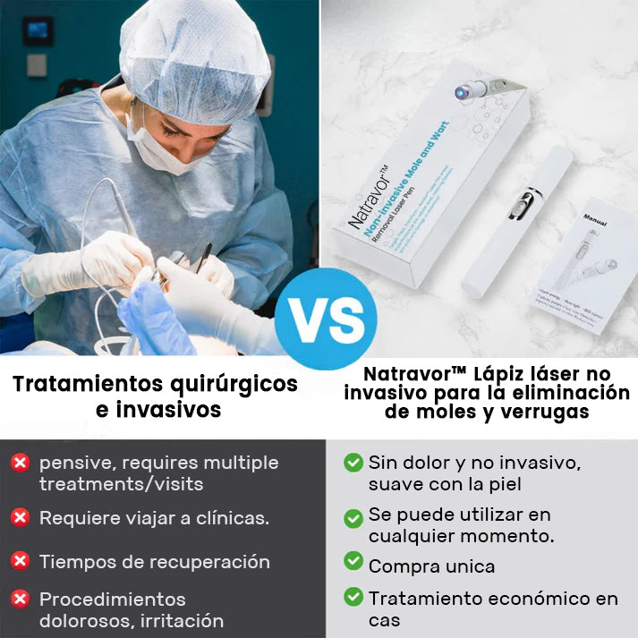 Dígale adiós a los costosos tratamientos dermatológicos, procedimientos quirúrgicos dolorosos y cremas ineficaces que no brindan resultados duraderos.El lápiz láser Natravor™ proporciona una solución segura, no invasiva y de calidad profesional diseñada para un uso conveniente en el hogar. Con tecnología láser de CO₂ de precisión, ataca eficazmente lunares, verrugas, marcas en la piel, manchas oscuras y otras imperfecciones, todo sin cortes, quemaduras ni irritación. Su modo ultrapulsado aprobado por la FDA garantiza una eliminación controlada capa por capa, minimizando el riesgo de cicatrices y promoviendo al mismo tiempo la curación natural y la regeneración de la piel.