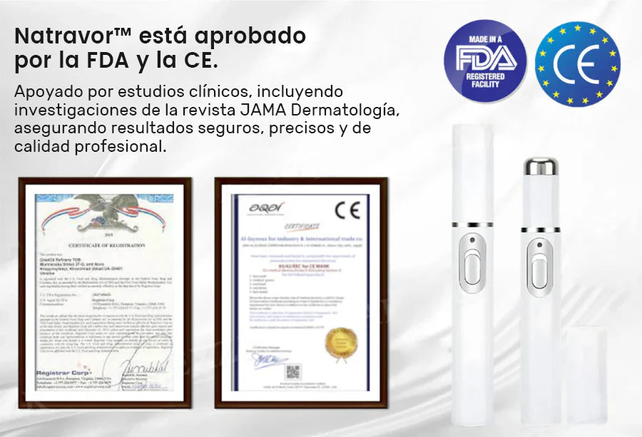 ✅ ¡Sí! Natravor™ cuenta con la aprobación de la FDA y la CE, está probado por dermatólogos y está diseñado para un uso seguro, indoloro y no invasivo en casa. Ofrece resultados de calidad profesional sin los riesgos de la cirugía ni de los productos químicos agresivos.